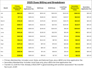 The Dues are based off of your level of membership: Primary REALTOR® Member, Secondary REALTOR® Member, Transfer REALTOR® Member and Affiliate Member. Please note the membership dues are prorated monthly with the exception of the application fee that is not prorated.